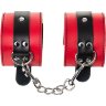 Оковы на ноги - волнующий воображение аксессуар, ведь это способ зафиксировать ноги партнера и получить полный доступ к его телу. Оковы из мягкой натуральной кожи сочетают в себе элементы, возбуждающие страсть и фантазию: красный и черный цвета и отделка металлическими элементами. В них будет комфортно подчиняться и ощущать ограничение свободы действий. Не натирают и имеют надежную степень фиксации. Размер легко регулируется металлической пряжкой. С помощью металлической цепочки и карабинов можно фиксировать ноги вместе, либо дополнить игру цепочкой и сковать ноги в широко разведенном положении. Длина манжет - 28 см., ширина - 6 см. Длина сцепки - 15,5 см. Страна: Китай. Материал: натуральная кожа.