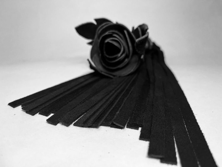 Длина: 4 см. Восхитительная мини-плеть, украшенная чёрной розой. Цветок полностью выполнен из натуральной лаковой кожи, листочки розы и рукоятка выполнены из мягкой натуральной кожи, а хвосты плети - натуральная мягкая замша. Размеры этой плети очень изящны, поэтому данную плеть можно использовать, как генитальную, чтобы добавить новых ярких ощущений. Розочка очень удобно лежит в руке и создает неповторимую атмосферу и настроение, этот аксессуар никого не оставит равнодушным. Страна: Россия. Материал: натуральная кожа.