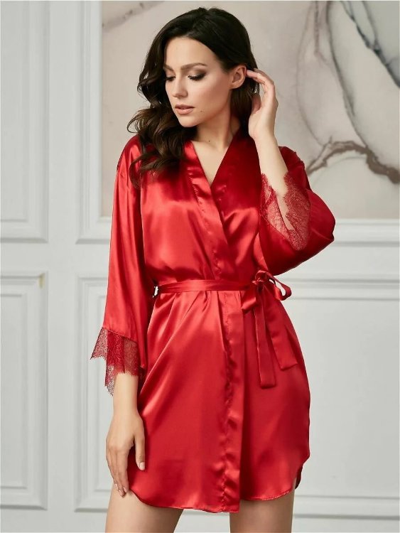 Короткий халат на запах из искусственного шелка с поясом, декорированный кружевом по рукаву. Страна: Россия. Материал: 100% полиэстер.