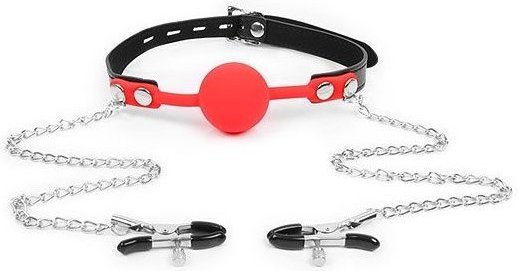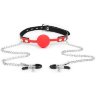 Красный кляп-шарик с зажимами на соски на металлической цепочке